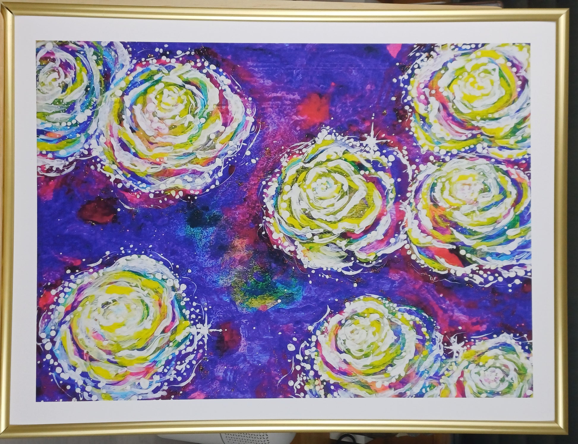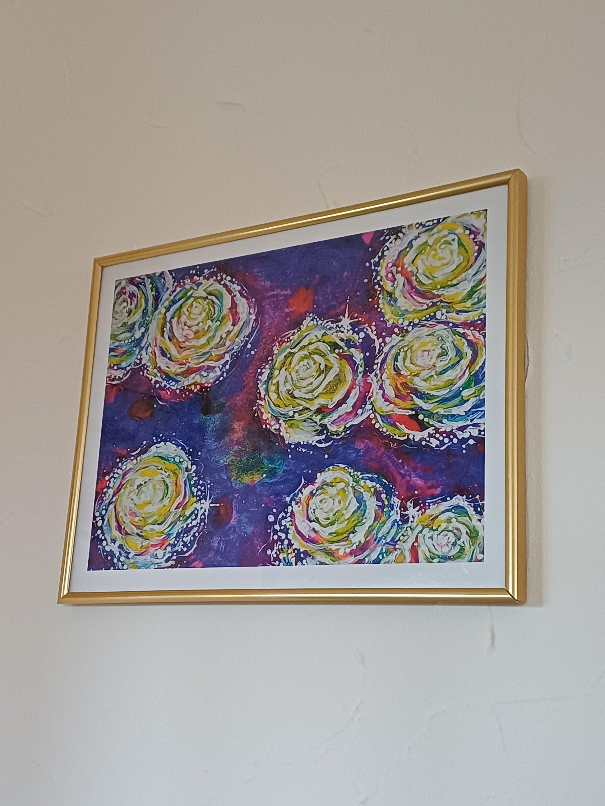 Ein Motiv, im Original intuitiv und frei mit Aquarylic Farben auf Leinwand gemalt, mit zarten glitzernden Verzierungen, die die sanfte Verbundenheit der Rosen zeigen.